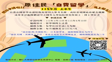 114學年度第2學期原民會獎助學金,自115年3月16日至4月9日開放申請!活動訊息2026-03-19 16:12:07114學年度第2學期原民會獎助學金,自115年3月16日至4月9日開放申請!