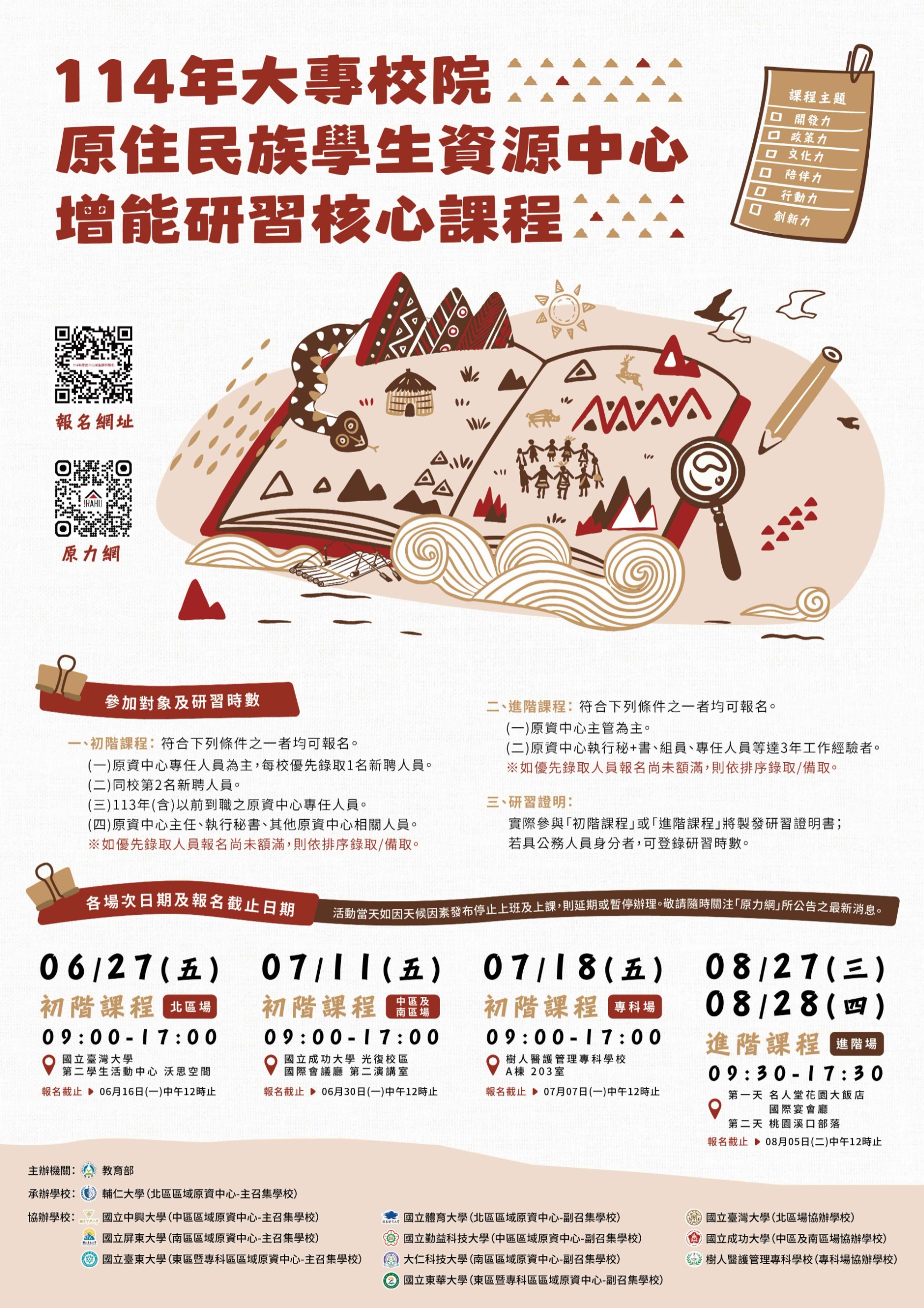 為了提升大專校院原住民族學生資源中心(以下簡稱原資中心)主管及專任人員的相關輔導知能,讓原住民學生更快適應校園生活,並獲得更專業的支持服務,本(114)年原資中心增能研習核心課程主題涵蓋「開發力」、「政策力」、「文化力」、「陪伴力」、「行動力」、「創新力」等6面向,以及針對在校內常見的問題設計進階課程,並以小組討論和世界(部落)咖啡館模式進行,透過探討與省思,進一步了解在校內執行相關工作時面臨的挑戰,共同擬定適切的解決方針。