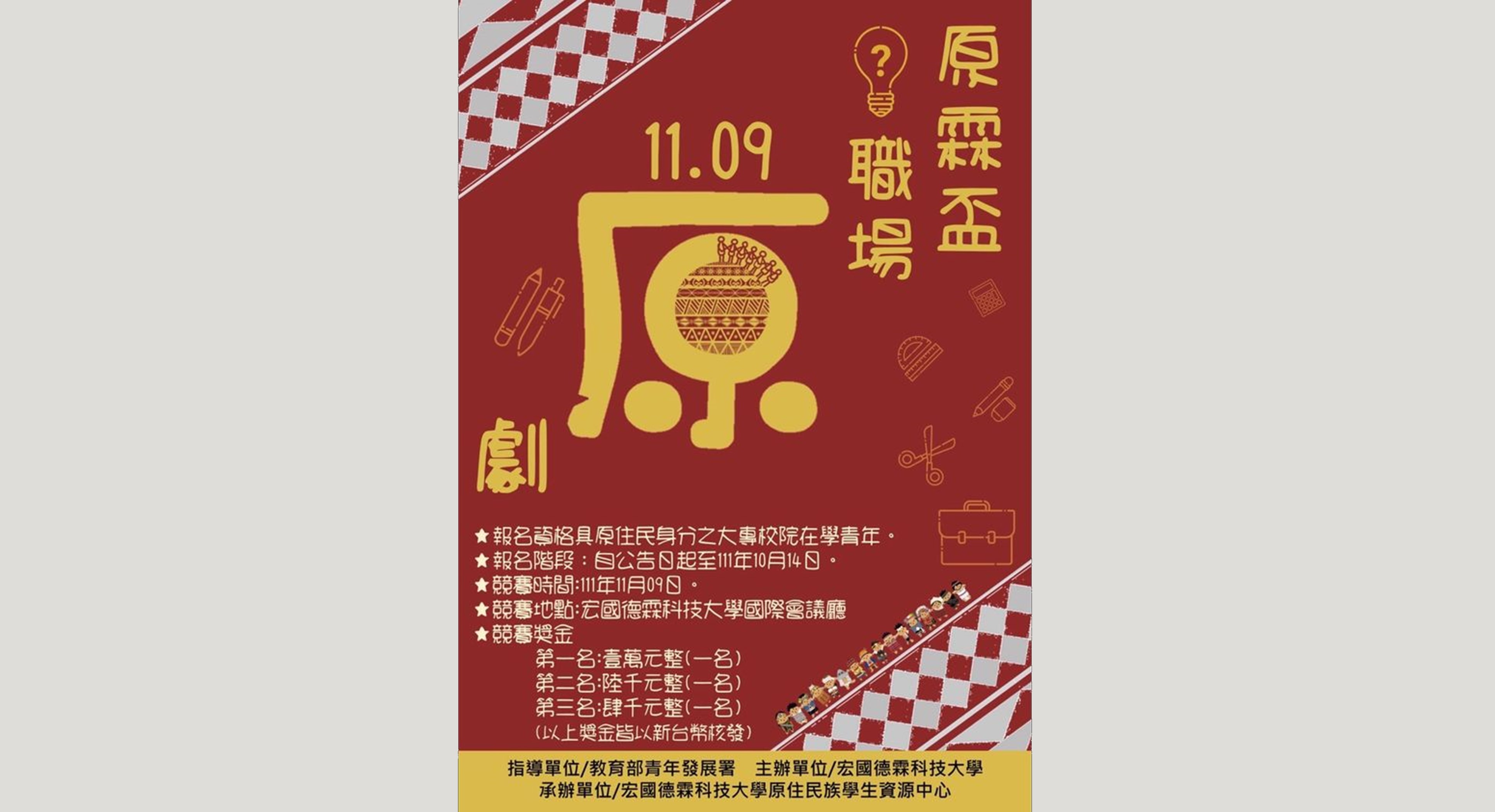 報名資格:具原住民身分之大專校院在學青年。(組別內可有非原住民族群參與, 但原住民身分人數需過半方可報名)
