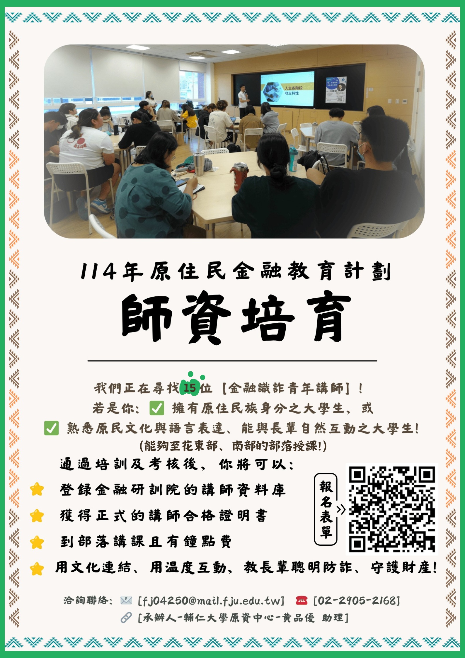 計畫起源:臺灣金融研訓院(簡稱金研院)配合原住民族委員會114年度「原住民族綜合發展基金貸款業務實施計畫」,將辦理100場金融知識普及講座,其中有特別針對高齡族群設計專屬課程。為了讓金融教育更貼近長者的生活與文化,我們誠摯邀請您加入「金融識詐青年講師團」!