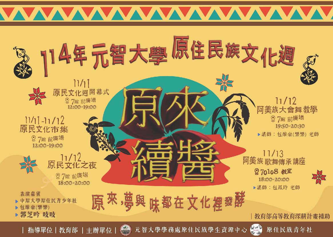 本活動係由元智大學學生學務處原住民族學生資源中心、學校社團原住民族青年社主辦,配合教育部全民原教政策結合原民文化市集、原民之夜及歌舞傳承講座,展現原住民族多元而豐富的文化特色,促進師生交流與理解,深化校園多元文化氛圍。
